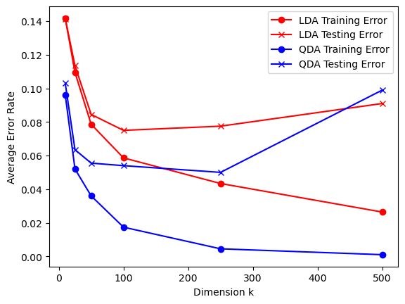Principal Component Analysis (PCA) was employed to reduce the dimensionality of the image data, with experiments conducted over various dimensions (k-values) to assess the impact on model performance. LDA and QDA models were trained on the dimensionality-reduced data, with the dataset split into training and testing sets to evaluate model performance. Error rates were computed for both training and testing phases to assess the effectiveness of each model.